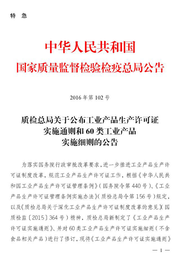 近日,從國(guó)家質(zhì)檢總局網(wǎng)站了解到,國(guó)家質(zhì)檢總局2018年8月27日發(fā)布了2018年第102號(hào)公告《質(zhì)檢總局關(guān)于公布工業(yè)產(chǎn)品生產(chǎn)許可證實(shí)施通則和60類工業(yè)產(chǎn)品實(shí)施細(xì)則的公告》。將吊消浙江10家噴涂廠家工業(yè)........