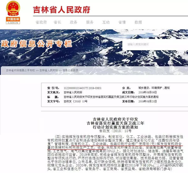 《吉林省落實(shí)打贏藍(lán)天保衛(wèi)戰(zhàn)三年行動(dòng)計(jì)劃實(shí)施方案》在有機(jī)化工、工業(yè)涂裝、包裝印刷行業(yè)推廣使用低(無)揮發(fā)性有機(jī)物含量的原輔材料和先進(jìn)生產(chǎn)工藝、設(shè)備。